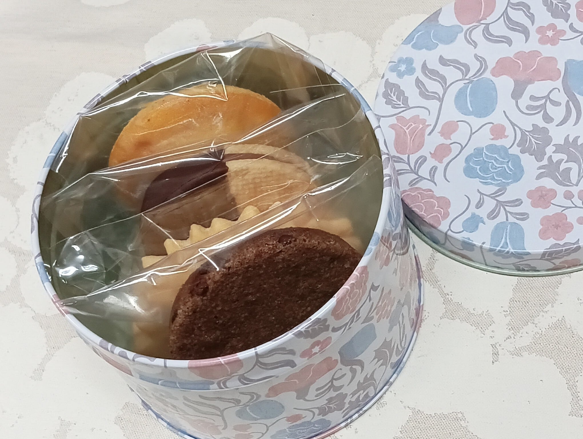 ブルーとピンクの花柄が優しくかわいいデザインの缶に、